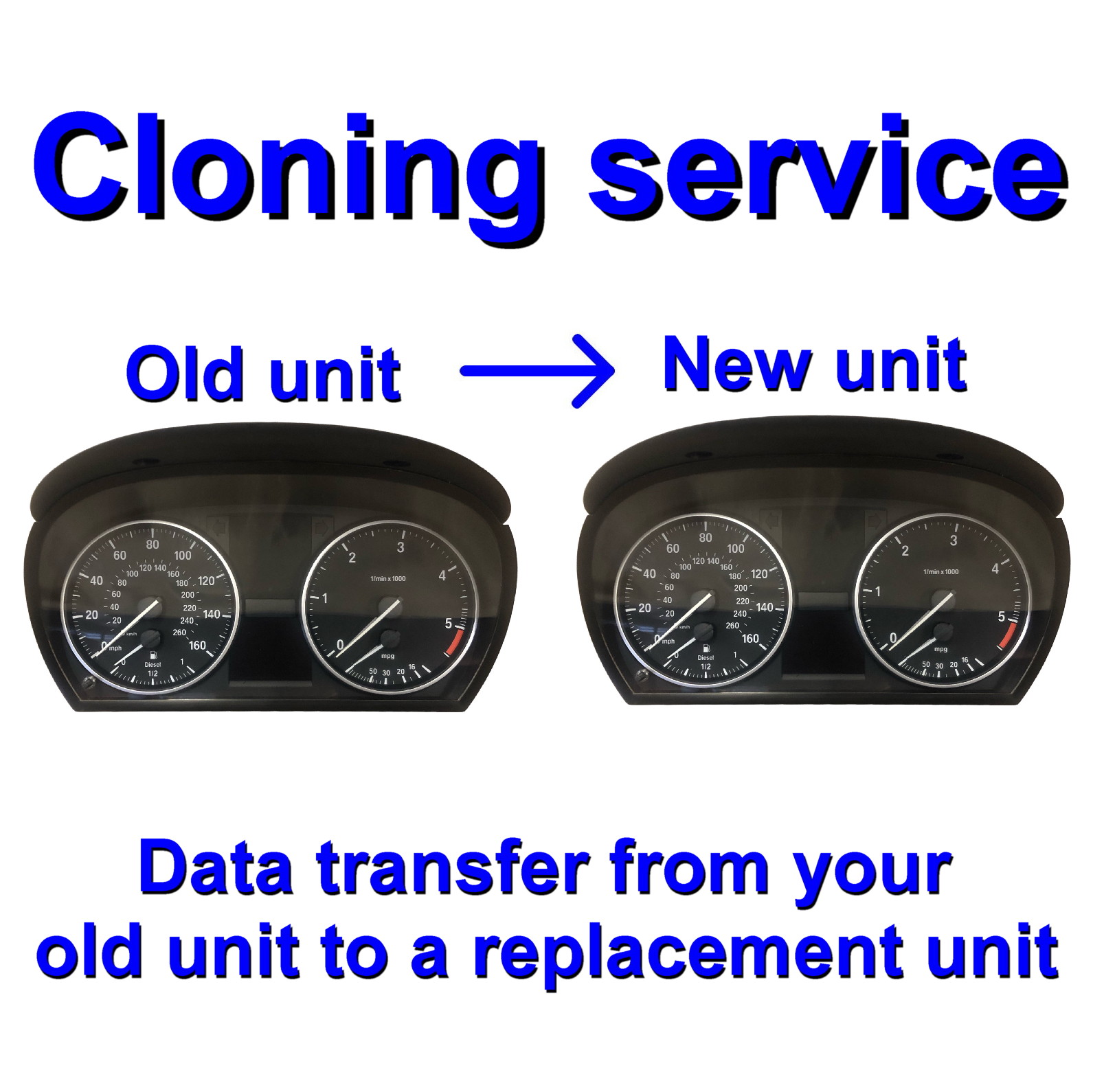 - The 'Cloning service only' is if you have a faulty Instrument cluster on your vehicle, for example it may be water damaged or have a blown component. If you are looking to replace the cluster on these vehicles you may be aware that you cannot simply remove one from another vehicle & install it onto yours as the cluster is 'Locked' to a different vehicles electronic / immobilizer system and the mileage will be incorrect. We have the solution! Simply send us your original (Faulty) cluster & the donor (Replacement) unit & we will transfer the data from your original to the replacement enabling the used unit to work on your vehicle with no further programming necessary. Once the donor unit has been programmed (Cloned) the coding of the unit will be correct & the car will start & function as it should. The mileage display will show the correct mileage of your car & the central locking etc will be unaffected & operate correctly. We do NOT need any PIN codes / keys or other items from your vehicle or the donor part to do this operation - We are able to clone these units even if you have 'No communication' with diagnostic tools with your original unit.